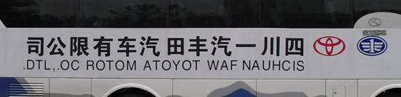 It needs some explaining. Chinese characters are much more flexible than letters of the alphabet. Books are often written left to right in paragraphs, as in English, but it’s also entirely normal to print a book with vertical columns for each sentence instead, and also starting at the back, reading the book from right to left. Buses are much more interesting. On the left-hand side of a bus they will write the characters as you would expect to see them in a book or in a newspaper. But it seems to be important to have the first character at the front of the bus, so that the sentence is ‘going forward’ when the bus moves, as it were. This means that on the right-hand side of the bus, the beginning of the title is on the right, and the end is on the left. Armed with this information, have another look at the title of the bus in English. Chengdu, September 2010. |